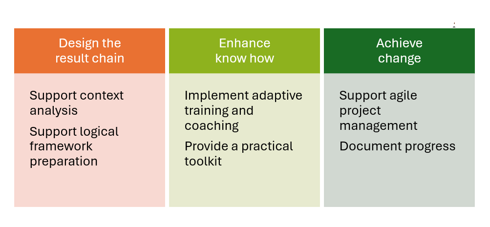 You are in charge of a social development project, an administrative reorganisation or a change in IT applications. You have to conceive the project, then recruit and train collaborators, you have to setup a solid finance management and manage a store. You have to make sure that your activities can generate results and tangible changes and finally you have to report on the project with up to date indicators. You may need support for one or several of these challenges